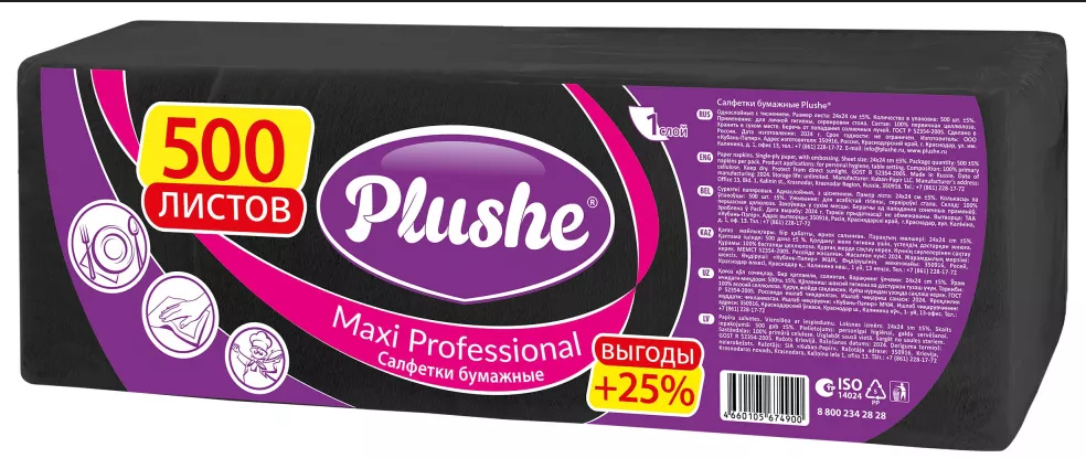 Салфетки Plushe Maxi Professional (артикул 84244) в черном цвете — это профессиональное решение для сегмента HoReCa (кафе, рестораны, отели), отличающееся глубоким «интенсивным» цветом и экономичной большой упаковкой.