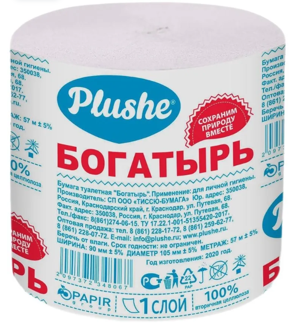 Бумага Богатырь туалетная Plushe 1-слойная, серая. Бумажная продукция санитарно-гигиенического назначения. Применение: для личной гигиены. Хранить в сухом месте. Беречь от попадания солнечных лучей.